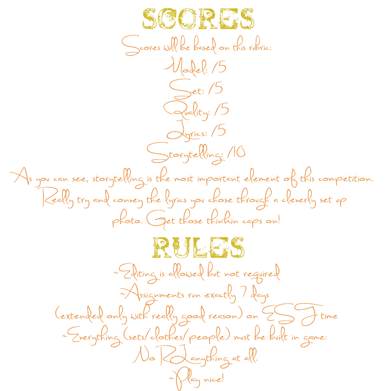 This picture, like just about all your others, is stunning. You have amazing quality, always decorate your sets and sims amazingly, edit like a pro - seriously your pictures are gorgeous. What killed it was the storytelling. I appreciate that you tried to go in a different direction, but as always with this comp, nothing that's written can be taken into account for the score and if I just looked at your picture with the lyrics and no explanation, I honestly would never have understood the relation. It was just a little too far fetched to have been able to make the connection without your help and ultimately that was the only thing that drug this, otherwise fantastic, photo down. But I have to be fair and can't start scoring differently now that it's the finale so unfortunately it puts you in third. However you still did a fantastic job, all through the competition and an amazing simmer Cinder. Well done :)