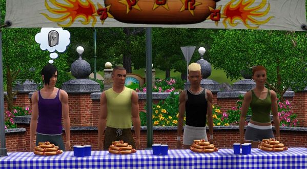 Shortly after getting settled back into his home, Jarrod decided get some new outfits for himself for the summer season so that he wouldn't swelter in the head. Although it rained most of the summer, there were a few hot sunny days including the first day of the Summer Festival which he visited on his first day off that week. Here, Jarrod is competing against Leighton, Marty & Justine in the hotdog eating contest which he won in the next photo.