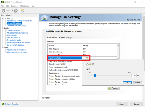If that doesn't help, or you want to play in windowed mode, click Global Settings, scroll down to Max Frame Rate (red box), turn it on, enter 60 in the box, and Apply.