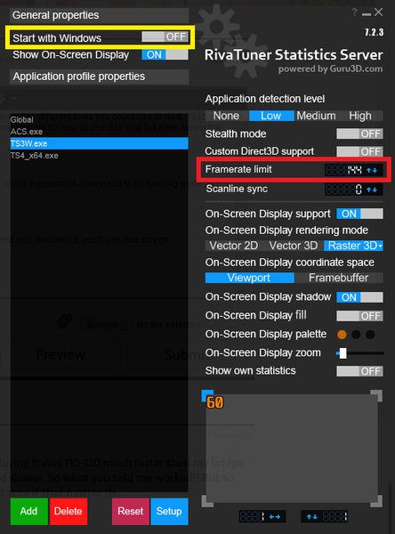 SpoilerWhen you've installed RTSS, open it, select TS3.exe (for an Origin install) or TS3W.exe (for a disc install), set the framerate limit to 60 (red box), and choose whether you want it to start with Windows (yellow box). The otehr settings don't matter unless you want to use them. You do need to leave it running in order for it to work, but you can minimize it to the Tray, which is where it will be if it starts with Windows as well.