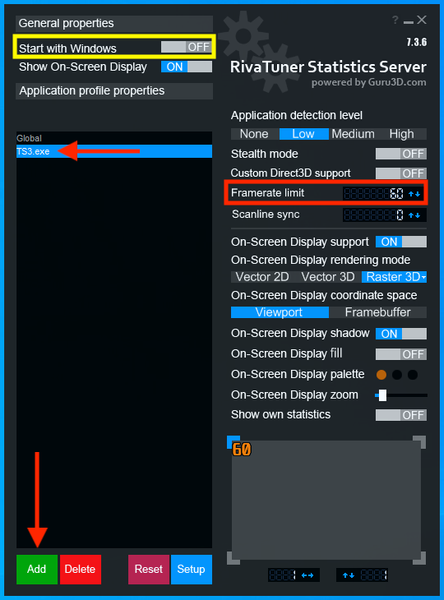 Unzip the RTSS.zip file (right-click and Extract), and run the installer. You may want to pin RTSS to the task bar for ease of use. Restart your computer, open RTSS again, and click Add in the lower-left corner. Select TS3.exe (EA App install) or TS3W.exe (with the W, disc or Steam install), in [install location]\The Sims 3\Game\Bin. Make sure it's highlighted, then set the Framerate limit (red box) to what you want.