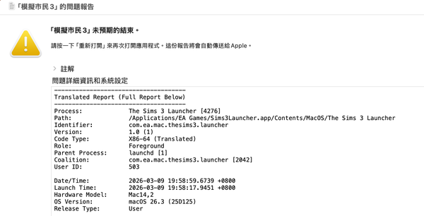Besides this problem, my Sims have some problems I keep ignoring.😭 I am not sure whether these problems caused the game to quit unexpectedly. First, when the game launches successfully, my launcher will quit and pop up a problem report for Sims, like 'Sims3 quit unexpectedly.' But it doesn't affect the game from launching. It also happens when I click the button to check the downloads, uploads, and installation parts on the Launcher.