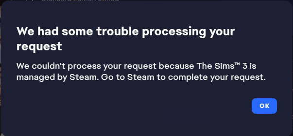 I have also tried repairing the game thru EA App, but it says I need to do that thru Steam. I have never played TS3 thru Steam therefore it does not show up in my Steam game list, so I'm not sure why it is telling me to do that.