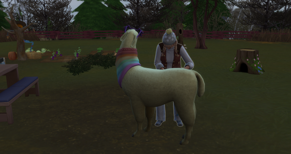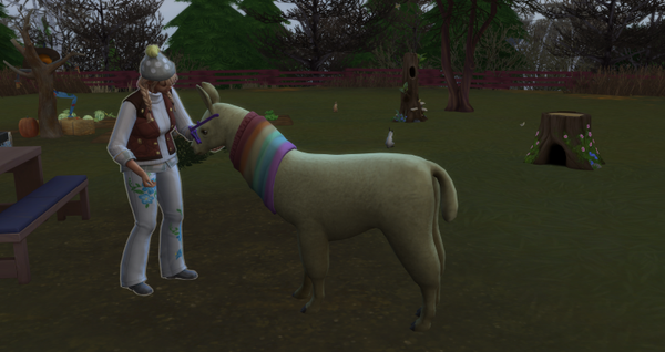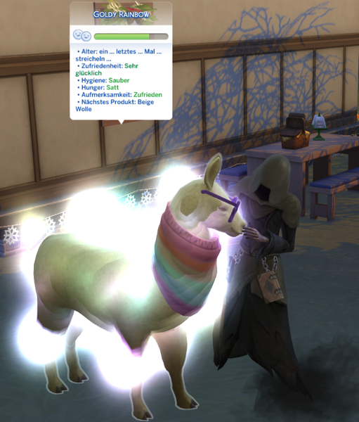 Auch für Schneefloecken hatte ich eine großartige Idee, um sie besser im Schnee zu erkennen. Mit einem Spezialfutter, aus den Pilzen im Garten färbte sich ihre Wolle ein. Die Mädels sind ganz begeistert von der roten Wolle, die ich ihnen nach dem Scheren bringe. Damit können sie nun noch farbenreicher ihre Strick- und Stickwerke gestalten. ((Und dann ritt es mich! Als ich diese Option im Gespräch mit Patchy sah.- Mir war auch klar das dies eventl. zu Nachwuchs führen kann - wer hatte nochmals den Liebesbalken? – Stimmt da war ja was bei Pepper))