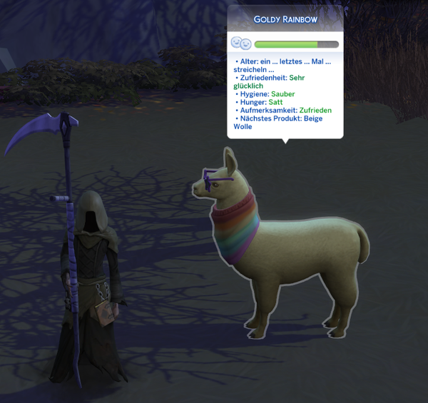 Mistles Blick am Kühlschrank, wie sie heimlich Kekse nascht - so süß! Schon berührend zu sehen, wie die Tierchen ins Jenseits kommen, da wird sogar der Sensenmann ganz weich. <3 Ohoh, da hat es Piper aber so richtig erwischt ... und Pepper scheint da auch etwas mehr zu spüren als nur Freundschaft, aber irgendwie trauen sich jetzt die beiden nicht, offen das anzusprechen, was ihnen auf der Seele brennt. Alle wollen Merry nicht verletzen, und der ahnt wahrscheinlich von dem ganzen Dilemma nicht einmal etwas. Wegen Patchys "Familienzuwachsgespräch" ... ich glaube, das könnte sich auf das neue Lama beziehen. ;)