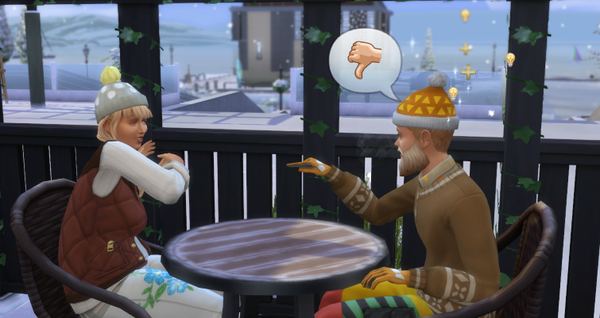 Ja da hast du recht @spinatblatt86 , zwischen denen beiden, da geht es richtig ab. >:) Den Streit hab nicht mal ich angeschubst, den hat das Spiel selbst gemacht. B) Ich hab das Gespräch mit freundlichen Aktionen mit dem Merry begonnen. Dann hab ich, weil mich dieser Plumbob und diese durchscheinenden Sechsecke auf den Bildern immer stören, auf Mistle (die ja nicht dabei) war umschalten. Ich wollte gerade herauszoomen, um eigentlich noch eine Aufnahme von dem Café zu machen. Da sah ich plötzlich wie einer nach dem anderen von den beiden rot wurde und bin dann sofort zurück gezoomt zu den zwei, um zu sehen, was da los ist. :o Den Rest hab ich dann schön auf den Bildern festgehalten. Dies war also nicht nur von Merry, nicht so geplant, sondern auch von mir nicht! Aber wenn meine Sims mir so eine Vorlage liefern, dann baue ich die natürlich in meine Geschichten ein. :D