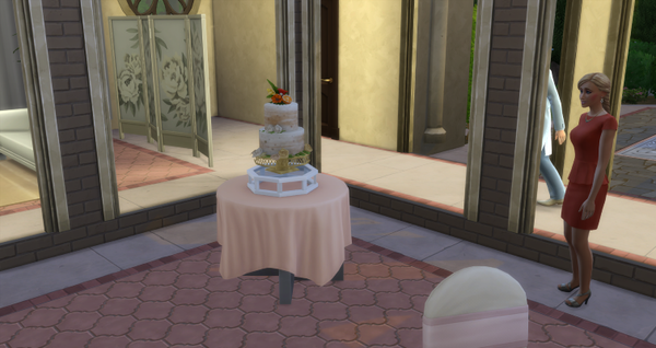 Immerhin taten meine Sims was sie sollten, der Rest so lala… Aber das ist ja auch bei realen Hochzeiten oft so, dass da einiges schiefläuft… was ganz anders ursprünglich geplant wurde. Nur dass Trauzeugen, Blumenkind, Ringträger und Offizant nicht ihren Job taten, das nehme ich denen schon leicht übel. :s Ich bin ja nicht generell gegen Überraschungen bei Hochzeiten, vor allem wenn es dann Beiträge der geladenen Gäste sind, wie Musikstücke vorspielen, Reden halten usw… Aber mit dieser und der nächsten Überraschung hatte ich nicht gerechnet. Denn die Torte war plötzlich auf ganz mysteriöse Weise verschwunden. Wie gut, dass Summer noch einen Laptop eingeschoben hatte, mit der sie schnell noch eine neue Torte organisieren konnte. Als die Trauung vollzogen war, fand ich dann endlich meine restlichen Gäste, unter anderem genau die, die zuvor Blumen streuen sollten, Ringe tragen usw…