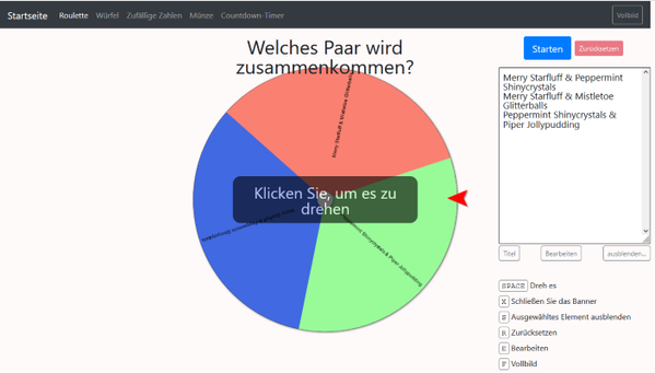 Da ich selbst noch unentschlossen bin für welche Paarzusammenstellung, wird meine eigene Stimme das Gücksrad entscheiden. Dieses Ergebnis werde ich zu euren Wünschen dann mit hinzuzählen. (( Wer möchte kann dies ebenso tun ))