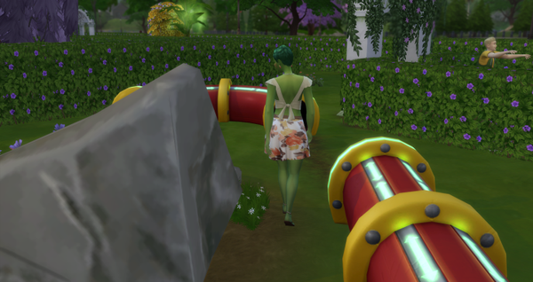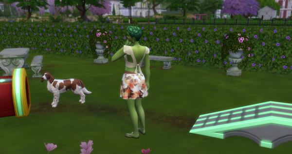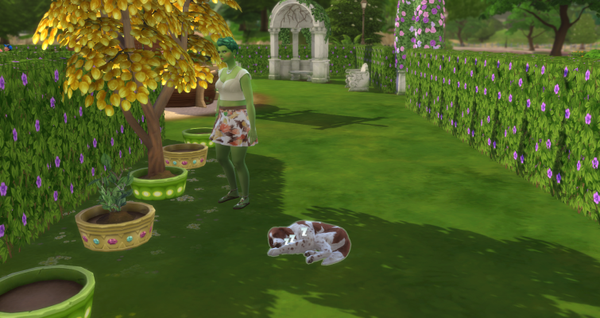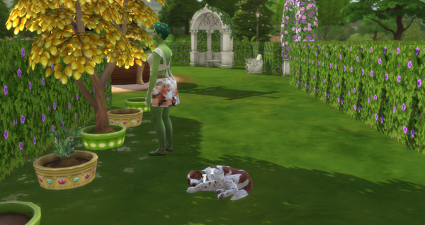 Flora hat nun endlich Sweety wieder zu sich geholt. Zusammen sind sie ein untrennbares Paar. Wo Flora war, war Sweety nicht weit entfernt von ihr. (Der Geldbaum steht übrigens in einem öffentlichen Park, für jeden Sim zugänglich. Allerdings gibt es die Erntebelohnung nur, wenn man das Grundstück auch regelmäßig besucht. Also ohne Fleiß auch hier kein Preis.)