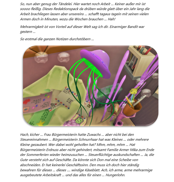 Ich muss mal schauen, wann ich ein neues WiWo-Kapitel anfange. Zeitlich ist es etwas eng, den WiWo-Spielstand gleichzeitig zu spielen neben dem RPG. Die NAPs scheinen aber letztendlich kein Hinderungsgrund zu sein, den irgendwann mal fortzuführen. Noch ist offen, was der Auftrag von Jaydden Lexxo tatsächlich ist ?, Bugsy und Pak'ha ??♂️, haben ihr Studium noch nicht abgeschlossen. Und Pak'ha wollte ja einen Rat der Okkulten gründen - wegen dieser ganzen Entführungen ?. Bürgermeisterin Erdnuss muss nochmal nach Armer Mika wegen sinkender Steuereinnahmen ??. Keine Ahnung, ob das losgehen kann, wenn Bürgermeisterin Schnurrhaar was Kleines erwartet ... und die Künstlerkolonie berichtete zwischendurch von ihrem freiwilligen ökologischen Jahr in Evergreen Habor ? nach Studien-Ende auf anderen Seiten - was eigentlich auch noch nicht abgeschlossen ist. Werde ich hier wohl irgendwann nochmal zusammenfassen.