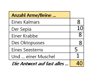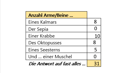 Krabben haben natürlich 4 Füße und die beiden Scheren, die man jetzt abknapsen müsste für die universelle Antwort auf fast alles ??? …