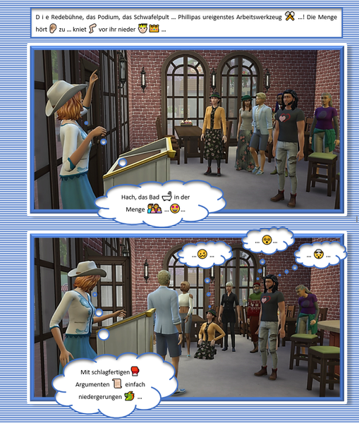 Außerdem höre ich schon wie die Rechenrädchen in P.'s Kopf rattern ob deiner Pläne für eine Bank und ein Spielcasino... was die Bürgermeisterin an Lizenzierungsgebühren bekommt, wunderbar! Da reichen keine drei Geldspeicher. Und die Steuern auf die Gewinne des Spielcasinos... wie die Sahne für die Katze.