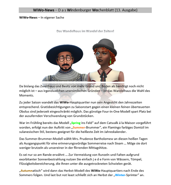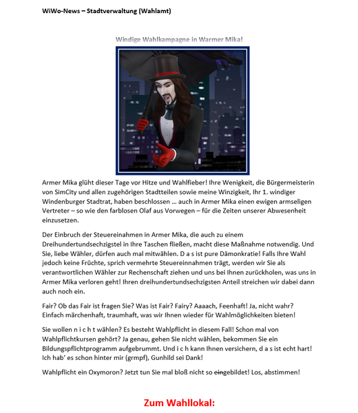 So, da bin ich wieder. Der 1. Windige Windenburger Stadtrat oder wie ich ihn nenne Ehegespons.... hat mir doch tatsächlich die Tastatur weggenommen. Er meinte ich solle mich aus der Wahl raushalten, ich hätte ja wohl gegen jeden Wahlkandidaten was einzuwenden. Und wenn niemand gewählt wird, müßten wir alle Arbeit machen.