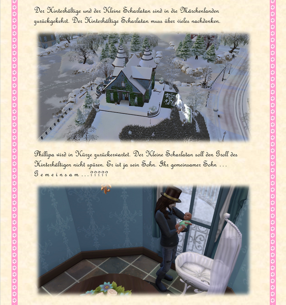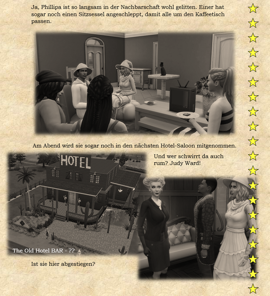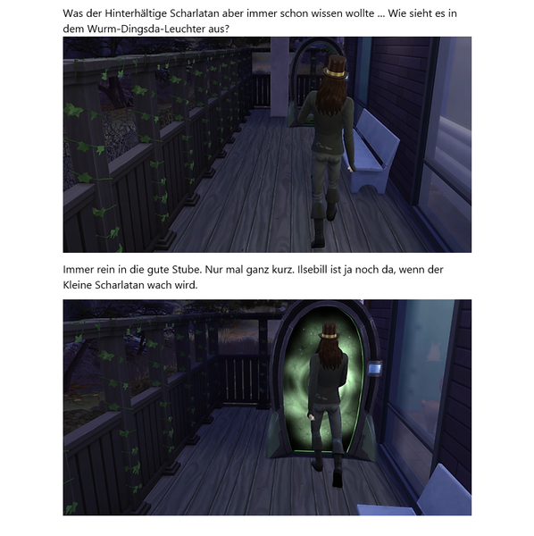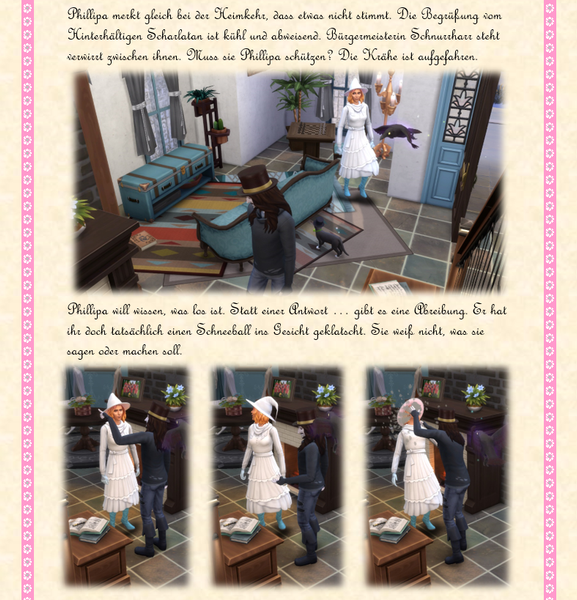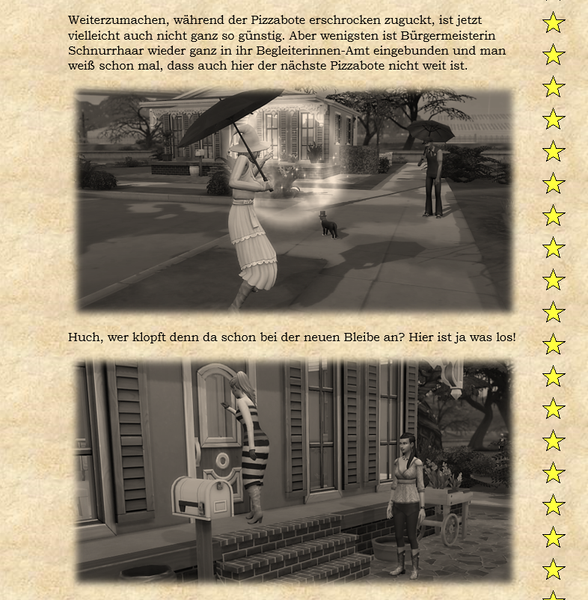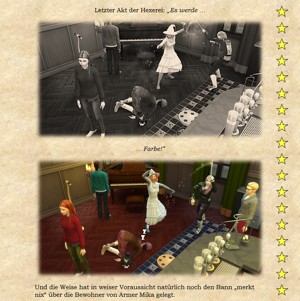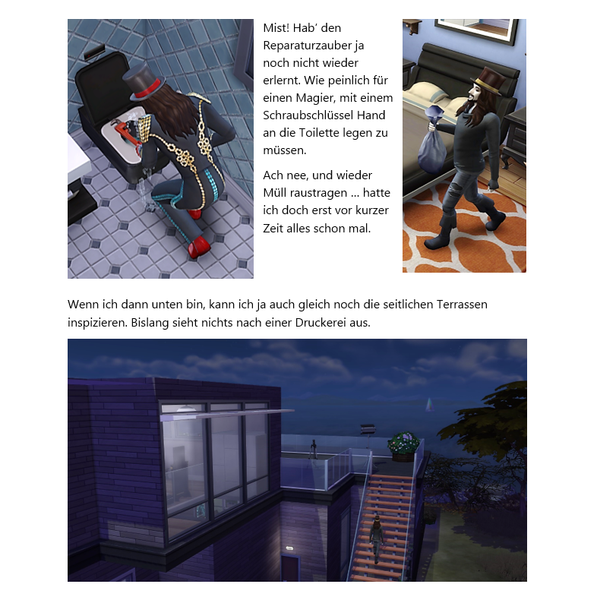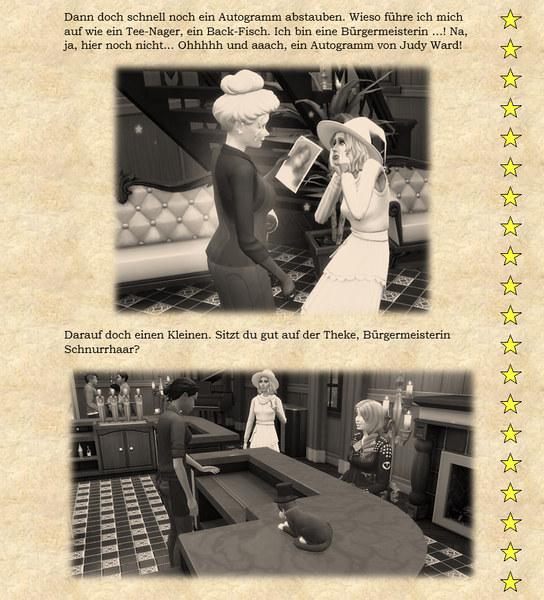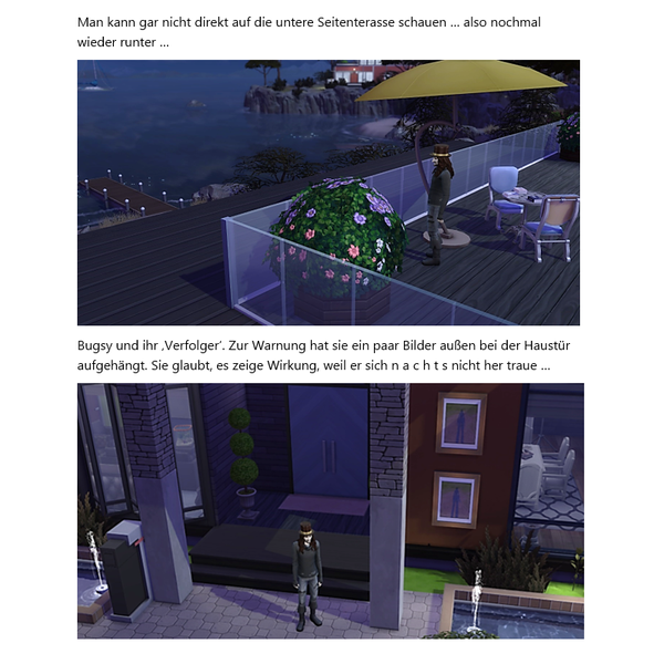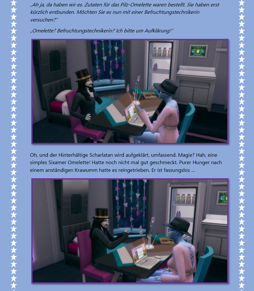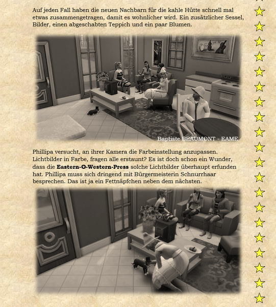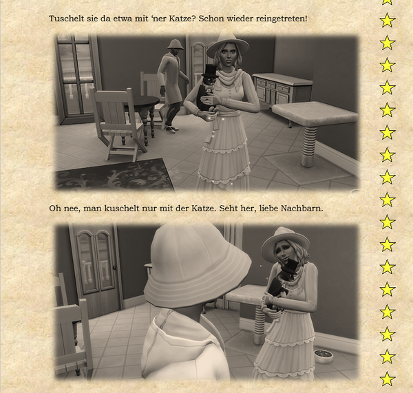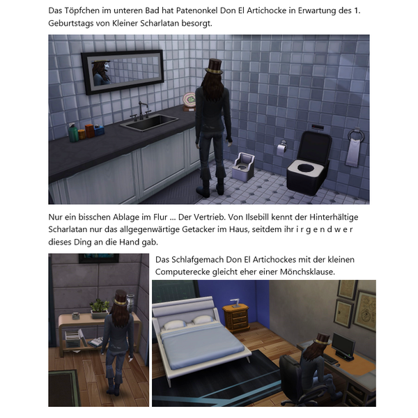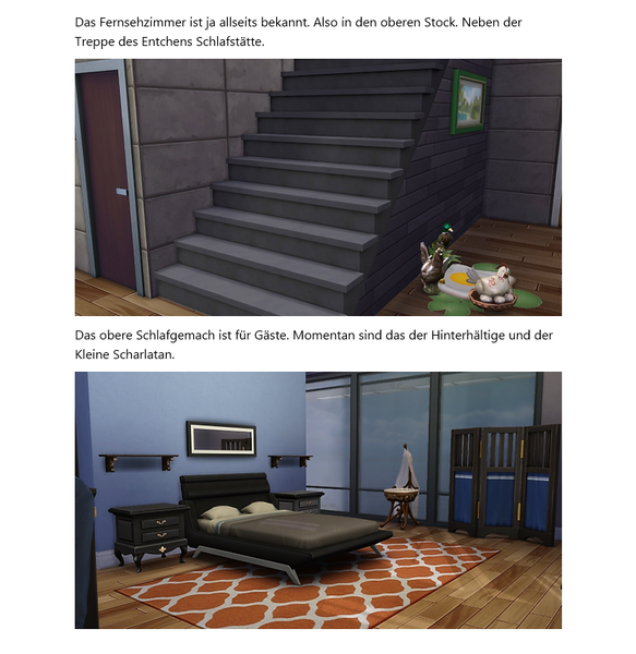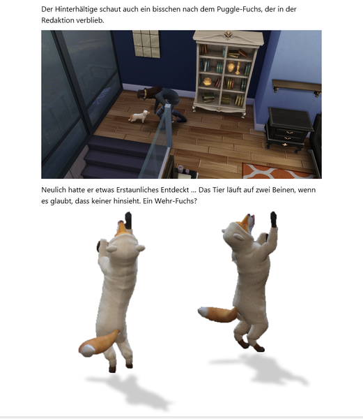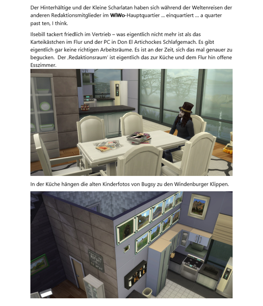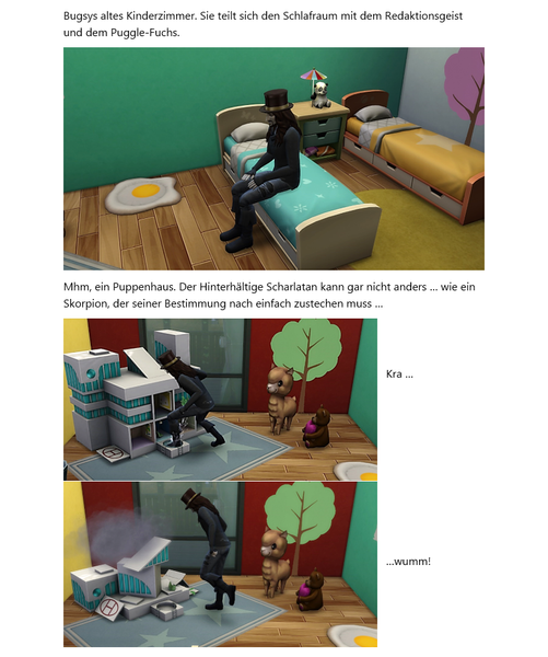 Der Vorteil von Sims 4 zu seinen Vorgängern ist die Galerie, über die sehr viel und sehr leicht geteilt werden kann. Andere 'Mitspieler' wie z.B. Phillipa Erdnuss, der Hinterhältige Sharlatan, der Redaktionsgeist Spionelfchen Naseweiß, Shakira Bashira und der Puggle-Fuchs sind Figuren von 'Zeitungsleser' bzw. das Konterfei ihres Profilbildes wie Quarre, das Entchen. Der Nachteil von Sims 4, der überhaupt diese 'Zeitung' in Leben rief, ist die Käferplage und die verzweiflungswürdigen Überarbeitungen zeitweilig. Das konnte ich irgendwann nur noch auf die Schippe nehmen oder Sims 4 sein lassen. Mittlerweile basteln sich absurde Geschichten um die Protagonisten.