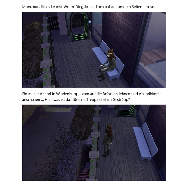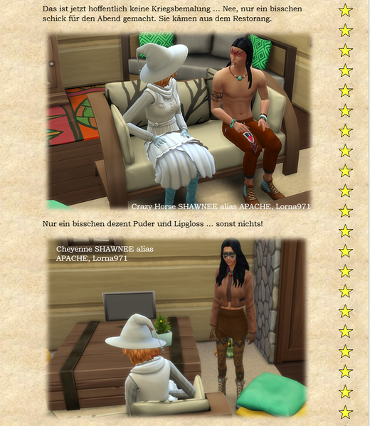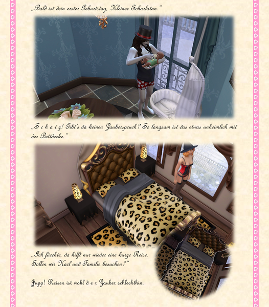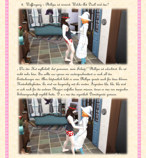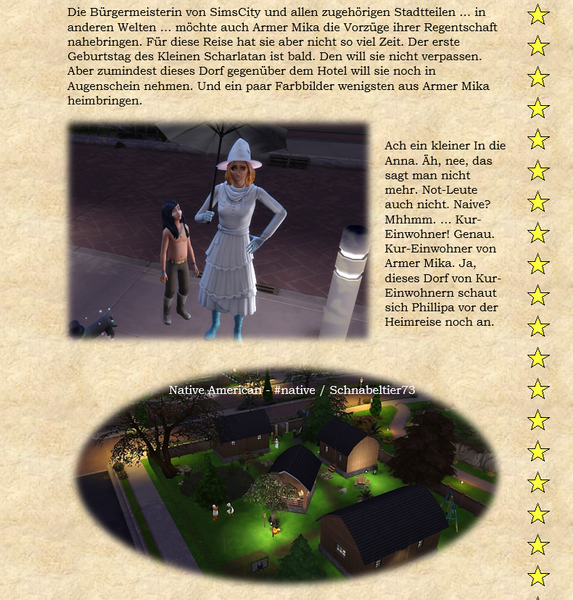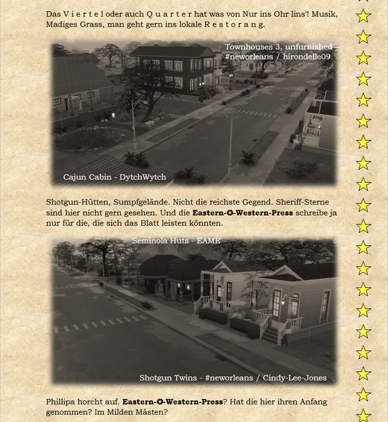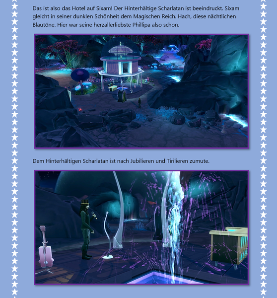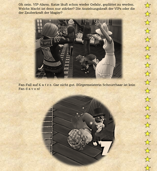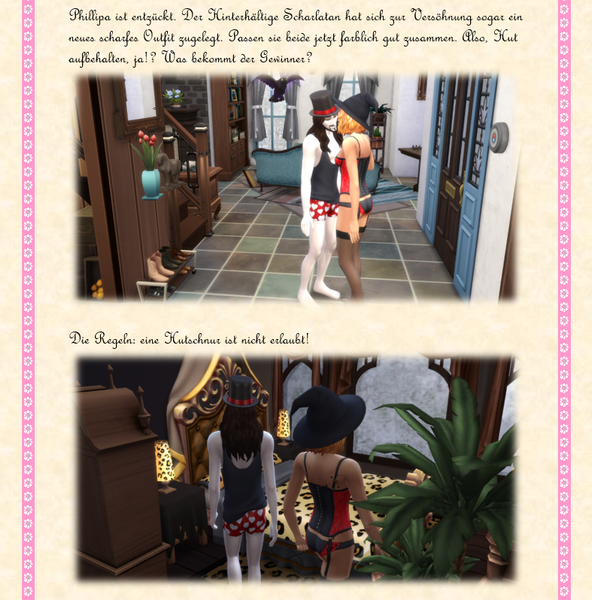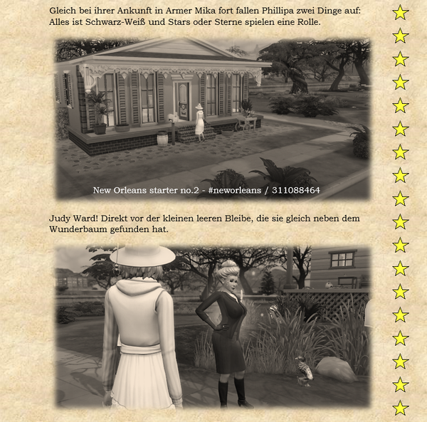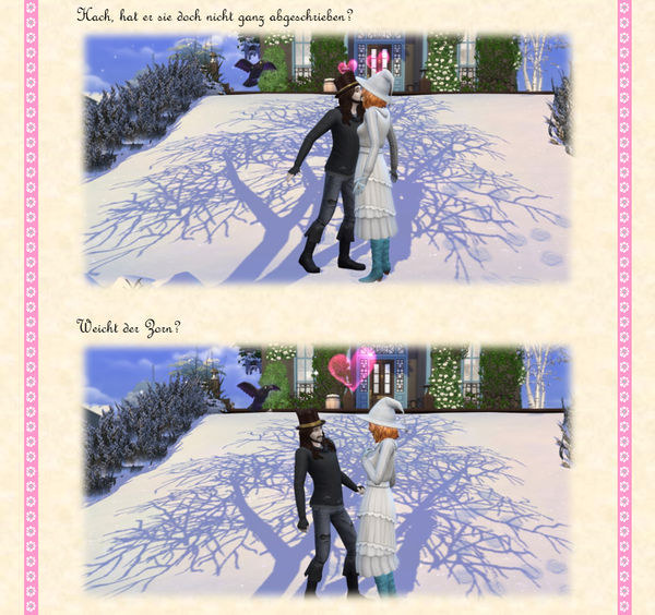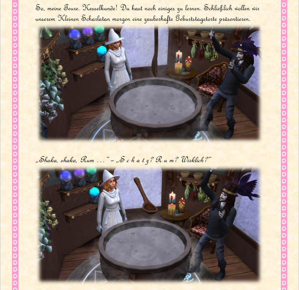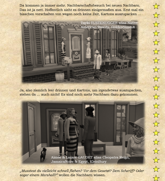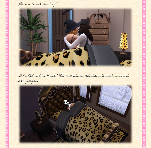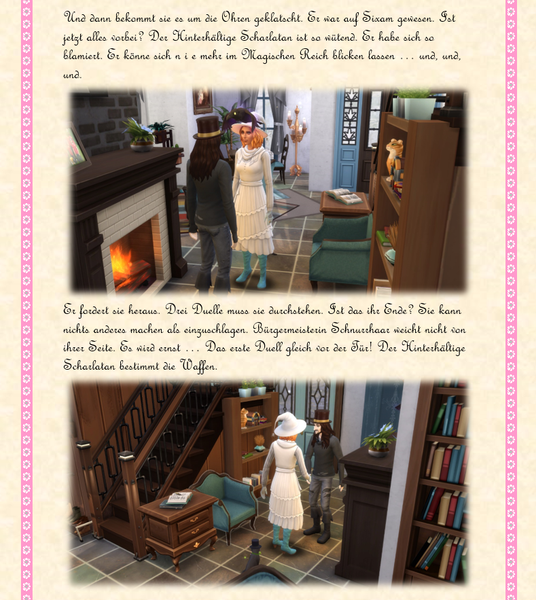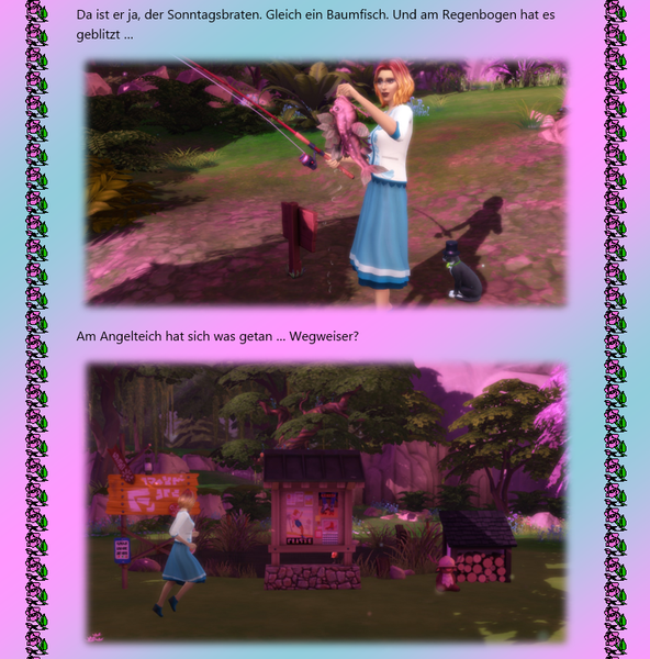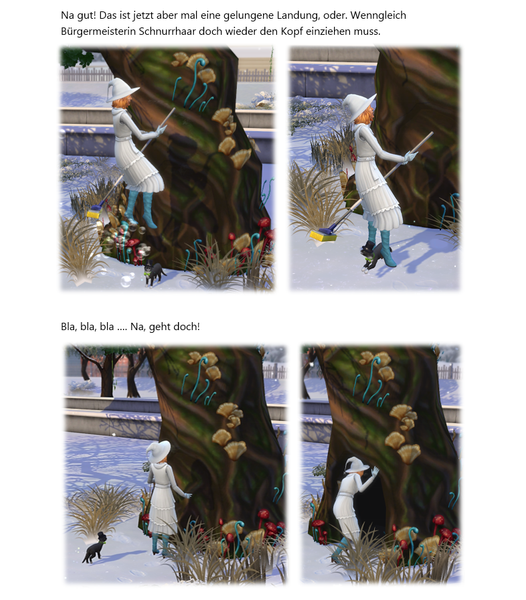 Der Vorteil von Sims 4 zu seinen Vorgängern ist die Galerie, über die sehr viel und sehr leicht geteilt werden kann. Andere 'Mitspieler' wie z.B. Phillipa Erdnuss, der Hinterhältige Sharlatan, der Redaktionsgeist Spionelfchen Naseweiß, Shakira Bashira und der Puggle-Fuchs sind Figuren von 'Zeitungsleser' bzw. das Konterfei ihres Profilbildes wie Quarre, das Entchen. Der Nachteil von Sims 4, der überhaupt diese 'Zeitung' in Leben rief, ist die Käferplage und die verzweiflungswürdigen Überarbeitungen zeitweilig. Das konnte ich irgendwann nur noch auf die Schippe nehmen oder Sims 4 sein lassen. Mittlerweile basteln sich absurde Geschichten um die Protagonisten.