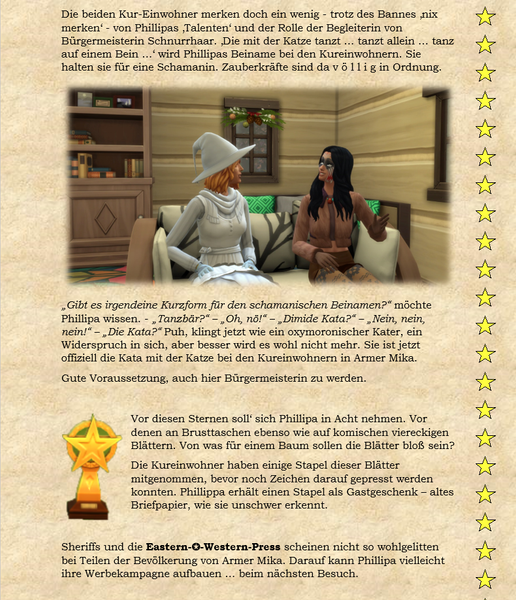 Derzeit werden einige künftige 'Folgen' sicher zum 'durch die Wände laufen' oder 'ineinander laufen' sein. Das hat recht zugenommen. Manches kann man nicht recht darstellen wie 'ich trink mir ein Wasserloch in'nen Bauch' oder 'ständiges singen und erstarren'. Wie kann man so etwas darstellen? Eigentlich nur filmisch und nicht über Zeitungspapier. Aber soweit bin ich noch nicht. Ich kann bisher nur Zeitung - und Inventur ... die jetzt mal halbwegs fertig ist. Es steht noch alles in meinen Themenspielständen - kann ich zumindest sagen. Aber nun hat die Bürgermeisterin Erdnuss sich in den Kopf gesetzt, Amer Mika zu erobern. Da kann ich jetzt g a r nichts für, dass die da nochmal hin fährt.
