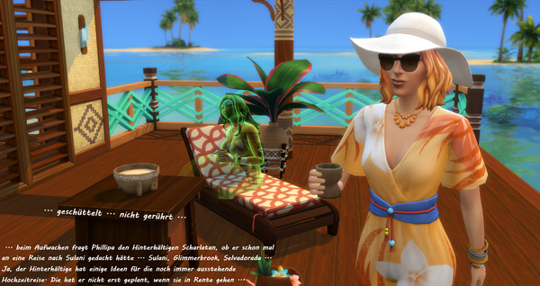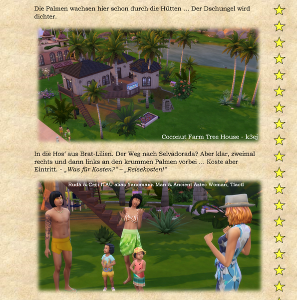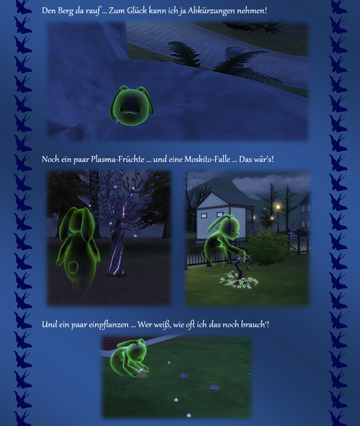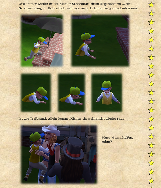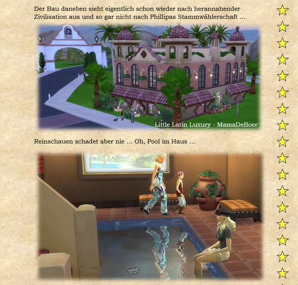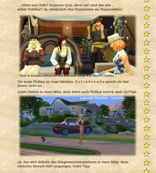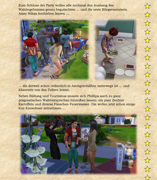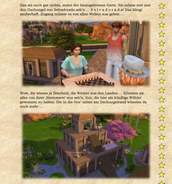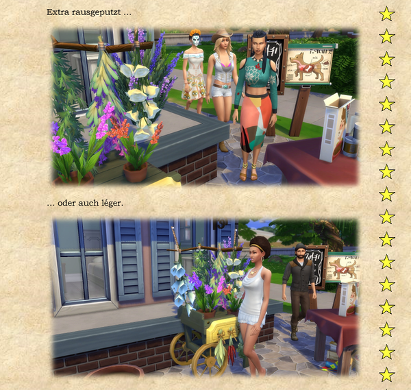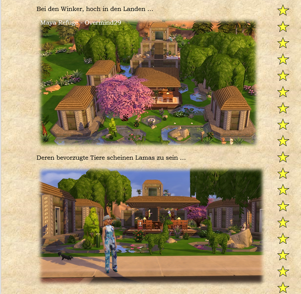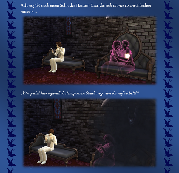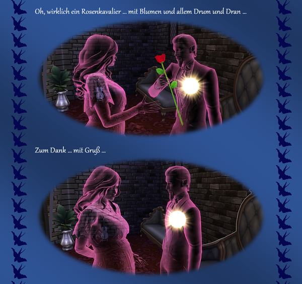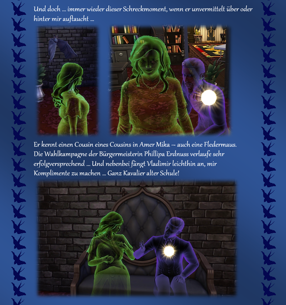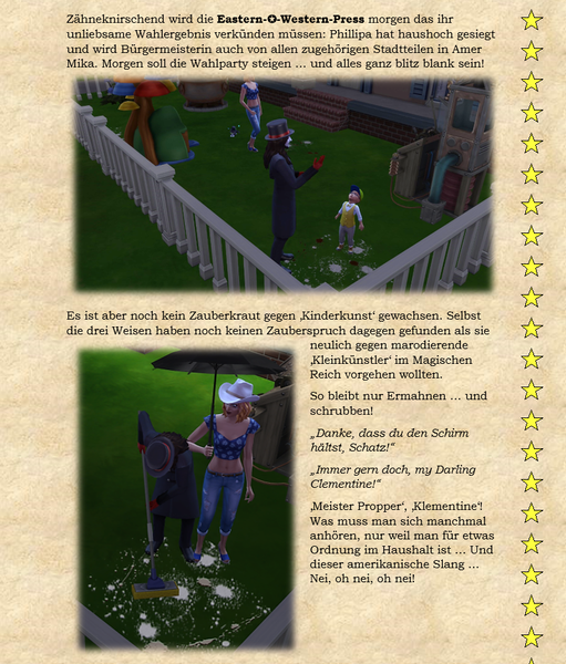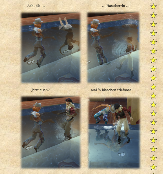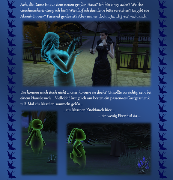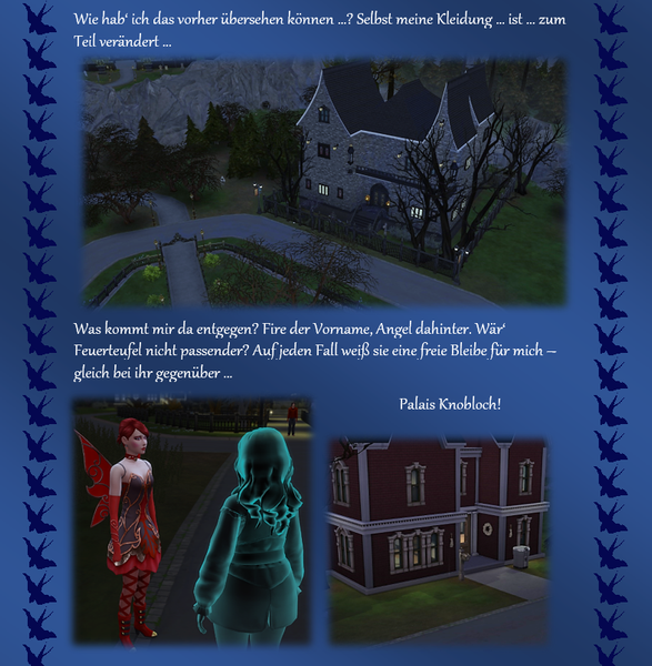 Woher ich die Themeneingaben habe, @watersimYMD? Frag mal die Bürgermeisterin von SimsCity und allen zugehörigen Stadtteilen ... oder den Redaktionsgeist ebenso das Entchen. Die liefern mir teilweise die Steilvorlagen ... Manchmal hier, manchmal per Mail oder Galerie oder auch einfach den Hausbau ... Einen Teil der Geschichten dichte ich ihnen nach Wunsch auf den Leib, einen Teil denk' ich mir aus, wofür man mich dann vielleicht auch mal verwünschen mag ... Wer weiß ... warten wir mal diese Woche ab ... o:) ...