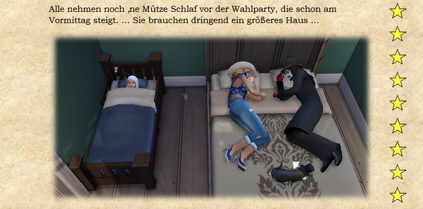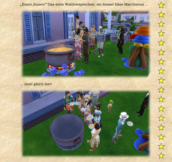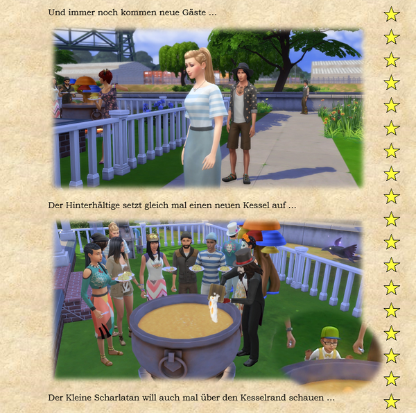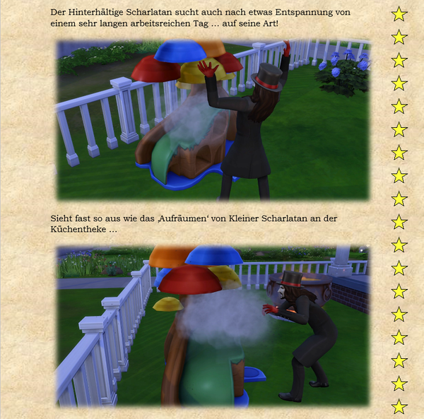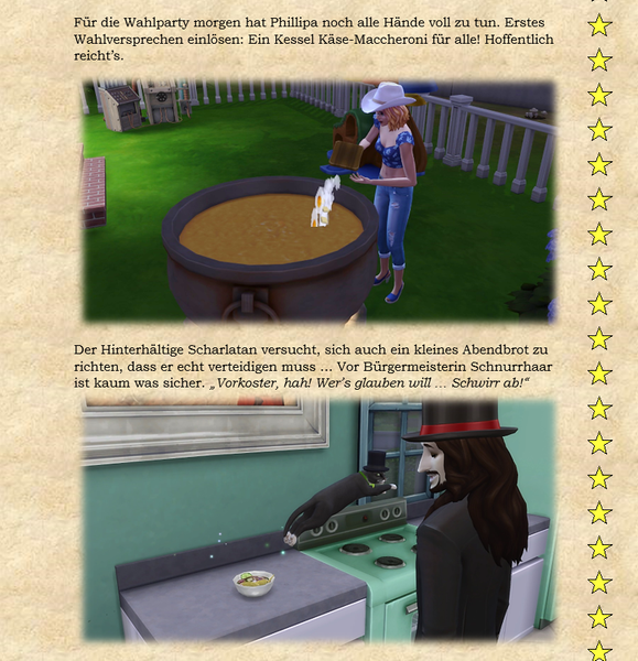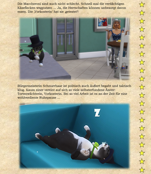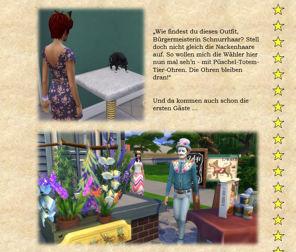 Zusammengefaßt: Ideenanstöße, eigenen Ideen und manchmal machen die Sims selber so einen Quatsch, der das ganze dann wieder in andere Bahnen lenkt. Der Kleine Scharlatan zum Beispiel fängt immer von selber an, Bürgermeisterin Schnurrharr nachzuäffen. Was soll man dazu anderes sagen außer: Fauch, Miau, Krall ... :) - Fischreuse6 years agoSeasoned Ace