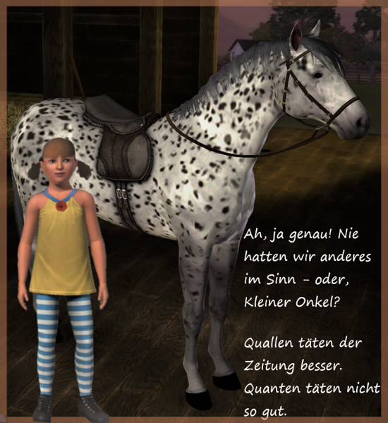 - Hoppel7856 years agoSeasoned AceHaha toll geschrieben! Ja, das mit dem Altern meiner Sims mag ich auch nicht (ich lasse meine Sims in einen bestimmten Rhythmus manuell altern) vor allem aber mag ich meine Sims nicht sterben lassen. :o Oft haben sich meine Sims wegen der Kleinkinder totgelacht aber wie mir scheint, wurde es in einem Patch behoben jedenfalls passierte es schon eine Ewigkeit nicht mehr.