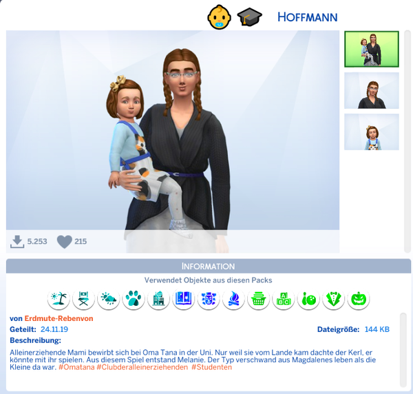 Stimmt, das Problem kenne ich aber dennoch sind es tolle Haushalte. Die Familie Van Houten aus Liederlande ;) finde ich ganz niedlich aber die gehören ja nicht zu den Statisten. haha Ich weiß nicht, ob du mit dem Kind in das Wohnheim kommst, es kann sein, das du dir ein Haus mieten musst. Ja, wenn ein neues Pack rauskommt, mache ich mir einen separaten Spielstand und probiere alles aus. - water_si766 years agoSeasoned AceHihi, schön geschrieben ?