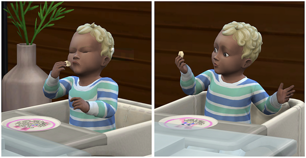 Steve kann inzwischen im Hochstuhl sitzen und Fingerfood probieren.