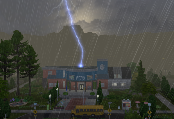 Ein schreckliches Gewitter treibt alle schnell ins Schulgebäude.