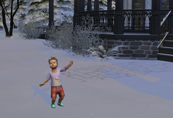 Und was macht Manuel inzwischen? Der rennt draußen im Schnee rum und kommt dann die Treppe nicht hinauf.