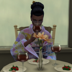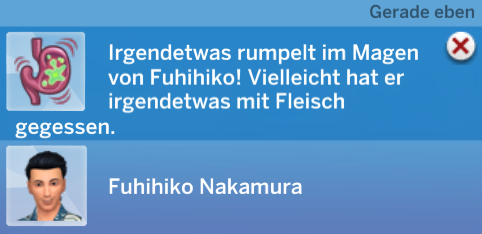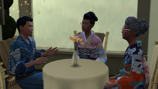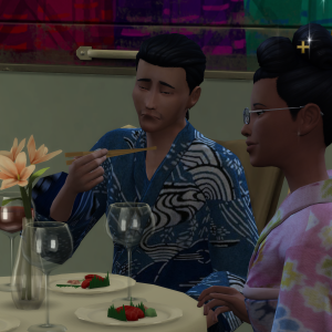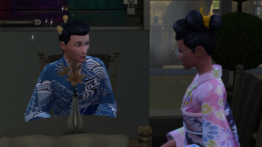 Die Schmerzen in seinem Bauch unterdrückte Fuhihiko so gut er konnte. Er wollte sich keine Blöße geben. Als später Ampithride die Toilette aufsuchte, saßen beide Sims alleine am Tisch.