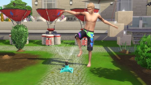 Stattdessen lenkt er sich etwas am Sprinkler ab.
