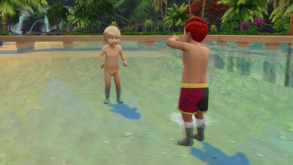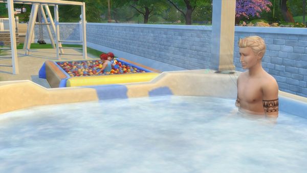 Elias gönnt sich ein wenig Zeit mit seiner Musik im Whirlpool und hat sogar die beiden Rotschopfe gut im Blickfeld.