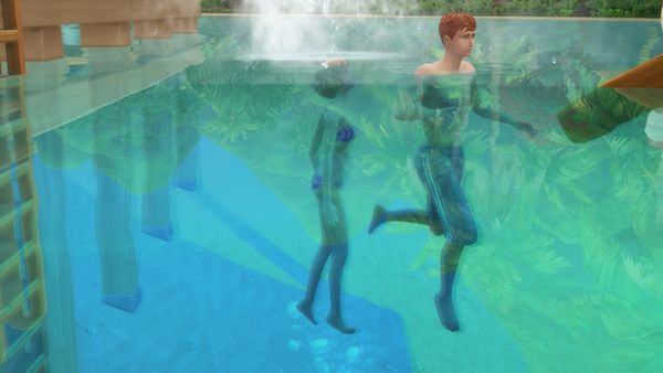 Amethysia holt ihren Micha auch mit dazu, der direkt eine Arschbombe ins Wasser macht.