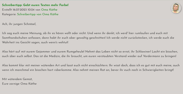 Sinnlosposts und Einzeiler sind im RPG nicht so gern gesehen. Niemand erwartet von euch, Romane zu schreiben - aber man kann einen Post über drei Dialogzeilen hinaus schon mal mit Beschreibungen und Sinneseindrücken ausschmücken. Versucht außerdem, mit jedem Post die Handlung ein bisschen voranzutreiben!