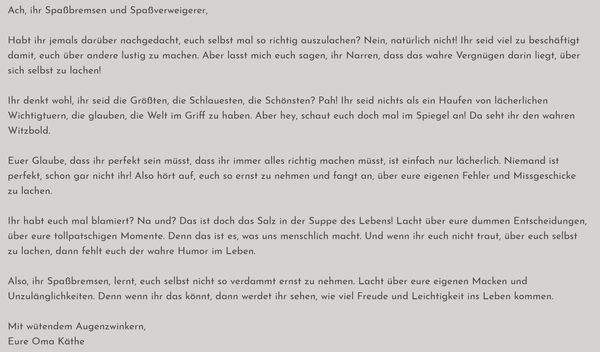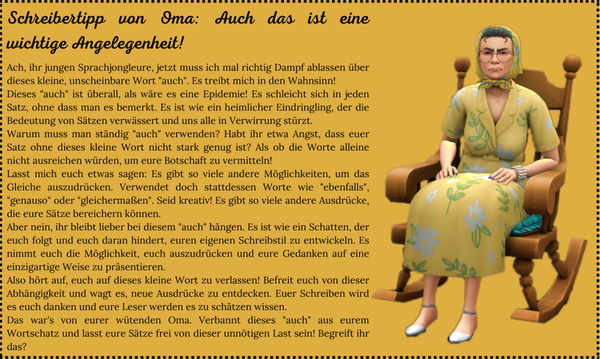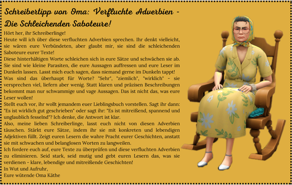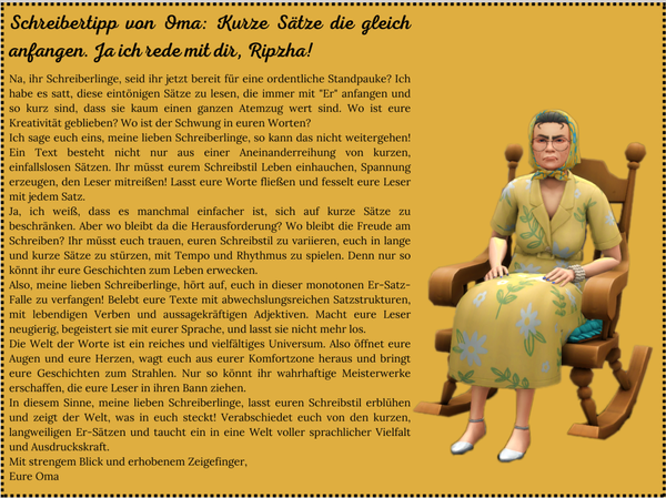 Hinweis:Um Verwirrung zu vermeiden, schreibt bitte in der dritten Person. Die Zeitform wählt ihr nach eurem belieben.