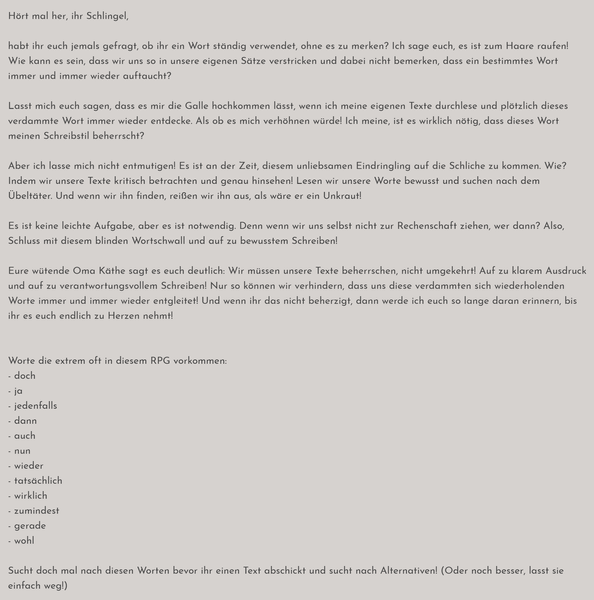 Sinnlosposts und Einzeiler sind im RPG nicht so gern gesehen. Niemand erwartet von euch, Romane zu schreiben - aber man kann einen Post über drei Dialogzeilen hinaus schon mal mit Beschreibungen und Sinneseindrücken ausschmücken. Versucht außerdem, mit jedem Post die Handlung ein bisschen voranzutreiben!