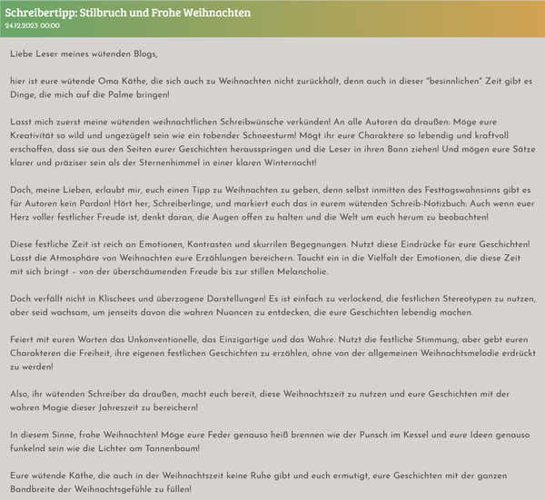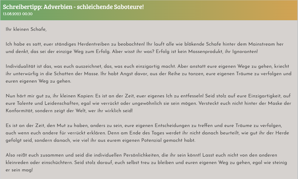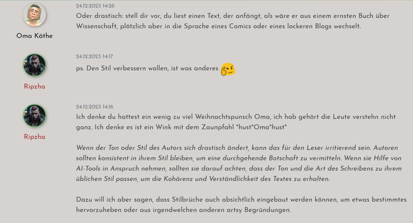 Hinweis: Fettschrift bei Direkter rede vereinfacht das kurze nachlesen eines oder mehreren vorangegangene Posts enorm. Da direkte Rede immer alle Anwesenden betrifft ist es meist das wichtigste was der Autor des nächsten Posts wissen muss.