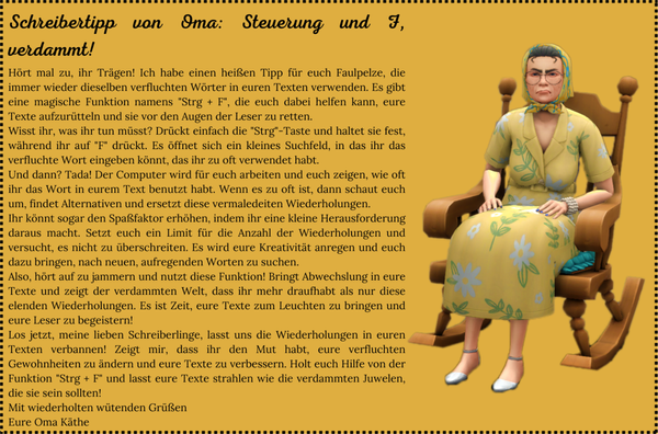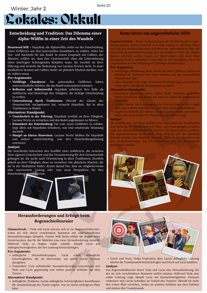 Jeder Charakter kann sich nur an einem Ort zur selben Zeit befinden und wenn er woanders eingesetzt werden soll, muss er sich erkennbar dorthin begeben. Am besten kennzeichnet ihr den Ort eurer Figuren mit dieser Formatierung: