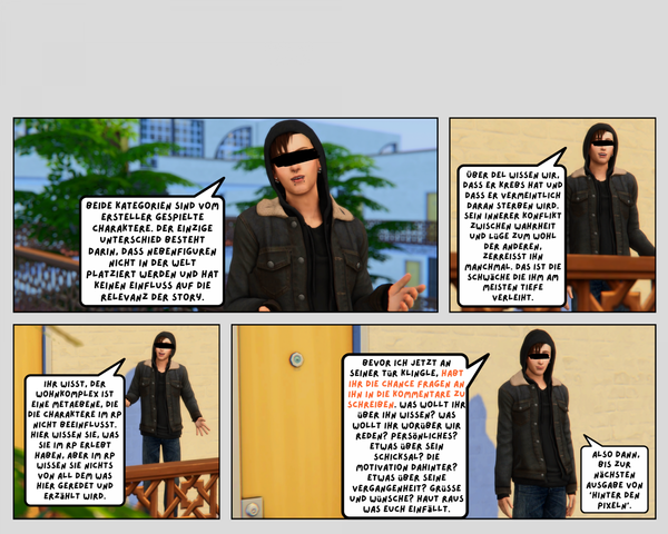 Denkt außerdem an die User die nicht alle Accessoire-Packs und Erweiterungen besitzen. Erstellt evt mehrere Outfits. Eines nach belieben und eines mit Grundspiel aussehen. Euer Character wird auf Fotos sicherlich auch so an den Gesichtszügen erkannt.