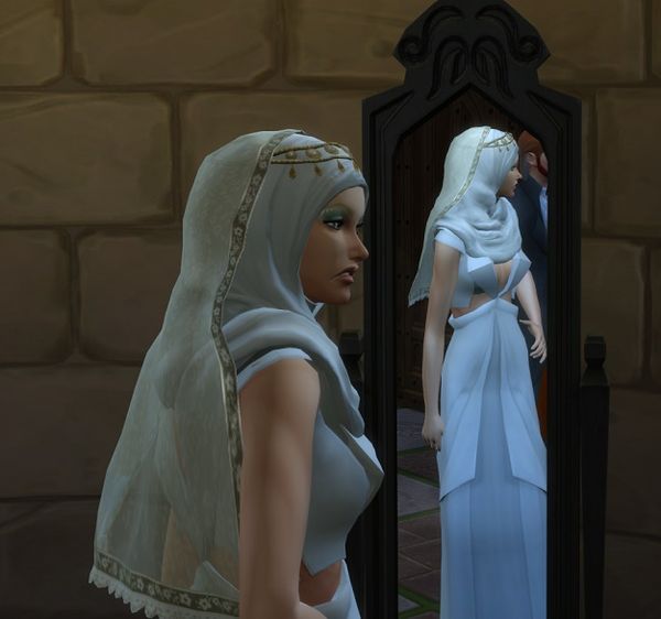 Dutifully, the teenager walked across the ancient stone flooring to the corner of the large room. Sweeping the hair out of her face as she removed the hood. Quickly, she changed out of her pants and top, folding them as she removed them. Carefully, pulling the garment on over her head. Turning to face the ancient floor mirror, she watched as T’Pran then assisted with the ornate head-covering. Once the girl was properly outfitted, T’Pran sat in a chair in the corner of the room. Brianna’s emotions were more than palpable, to her dismay. Outright fear the strongest of them all.