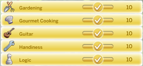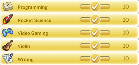 Master Chef; Fabulously Wealthy; Mansion Baron; Computer Whiz; Nerd Brain; Freelance Botanist; Chief of Mischief; Renaissance Sim; Bodybuilder; Grilled Cheese; Painter Extraordinaire; Villainous Valentine; Serial Romantic; Master Mixologist; Musical Genius; Bestselling Author; Joke Star; Public Enemy; Angling Ace; The Curator; Friend of the World; Neighborhood Confidante; Party Animal; Soulmate