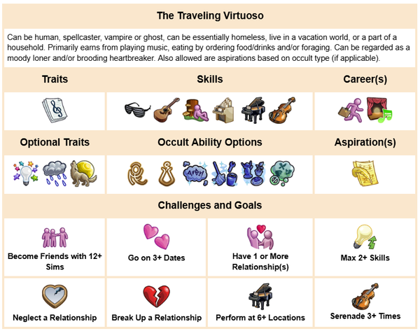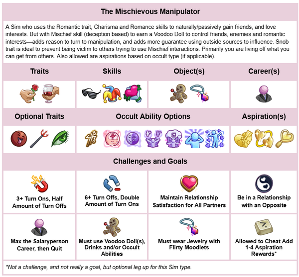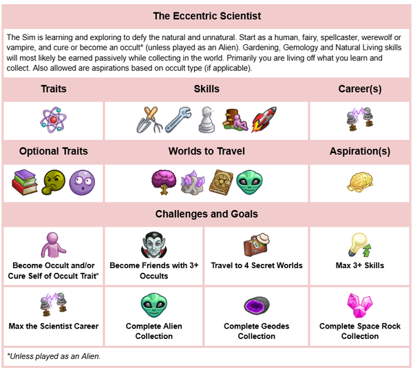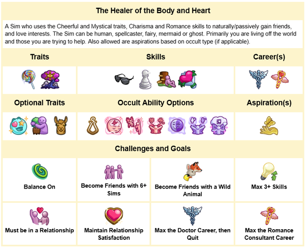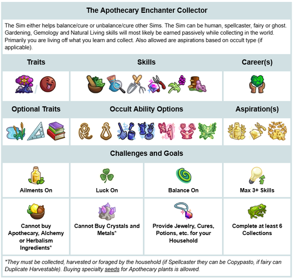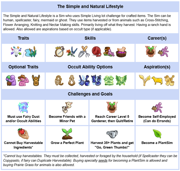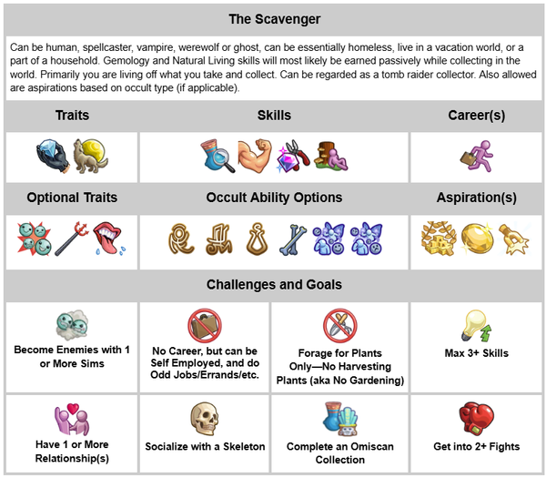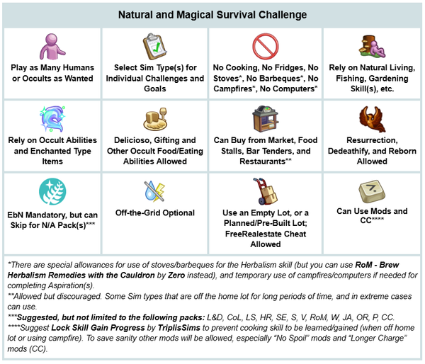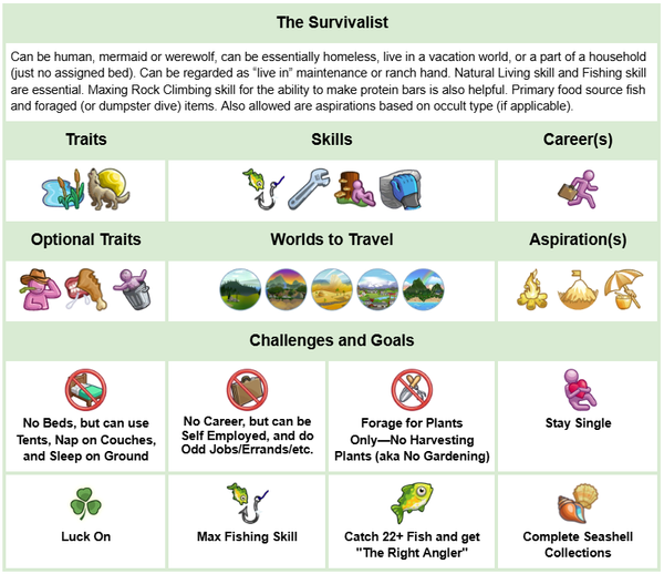Each Sim type is a different way to survive (with or without magic/enchanted help). Most of the types are encouraged selections, but can be customized to preference, and packs. As long as their Challenges/Goals are followed. You can have as many types as you want without duplicates.