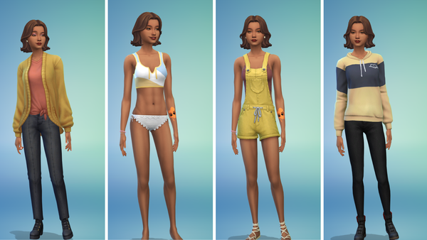 Party - DU but I'm not sure about the pants...(sorry my memory is awful apparently), Swimwear is the same top just different color and bottoms are Island Living, Hot weather - Island Living and B&H shoes, Cold weather - Base game top and bottoms, DU shoes.