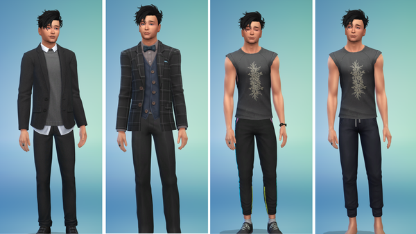 Everyday - Top and shoes are DU I think his pants are B&H, Formal - DU and...base game pants? (Edit: actually I think they may be either business chic or Cassanova Cave) His shoes I think stayed the same; Athletic - top is B&H bottoms are High School Years and I don't remember the shoes. Sleep - B&H top and DU pants.