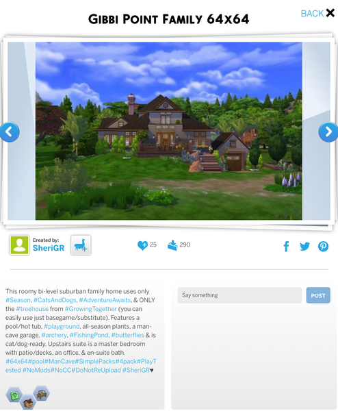 Gibbi Point Lakeside 2: https://www.ea.com/games/the-sims/the-sims-4/pc/gallery/E4C84F29D6E1499C94F95A726571D0C6Front:
