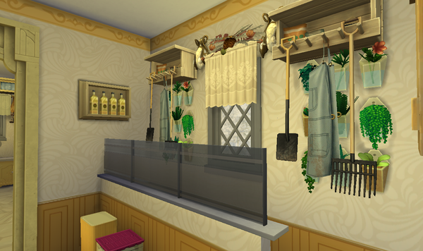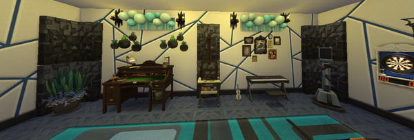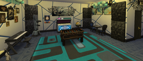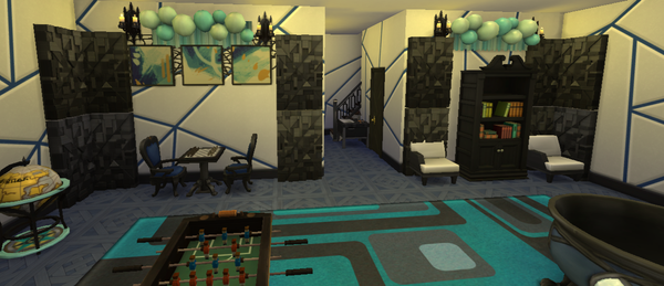 Katie’s home is lovely 🙂The exterior design is very nice, and the screenshots of it in Wintertime are pretty. Very lovely furnishing of each interior room! The pink colour of her bedroom and the room design are pretty. The wall art is very nice. Very nice open plan layout of the kitchen and living room areas. The basement hobby room is great! Very nice blue and black colours. She would enjoy doing the various activities there.