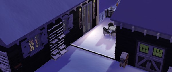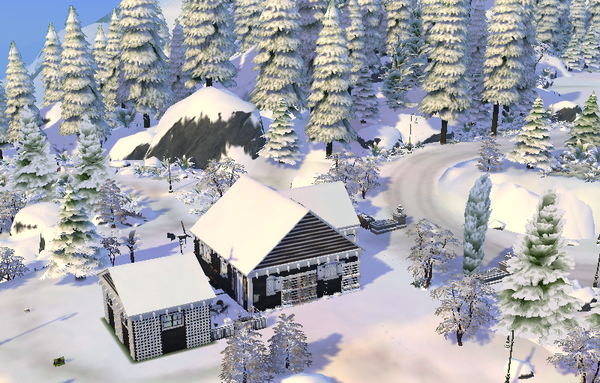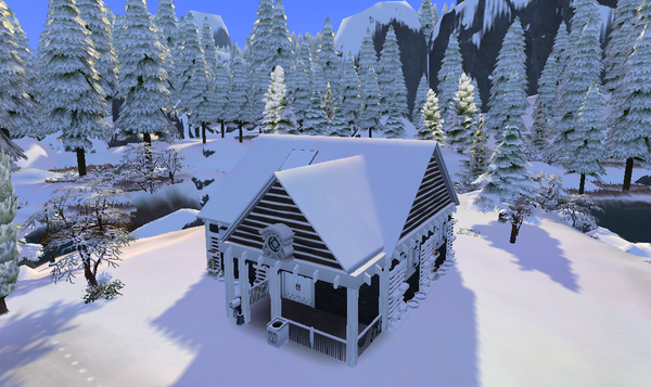 This is the exterior of Katie's home with winter scenery since it's the season to be jolly in that game save. Views of the back with her little stable and back patio are below.