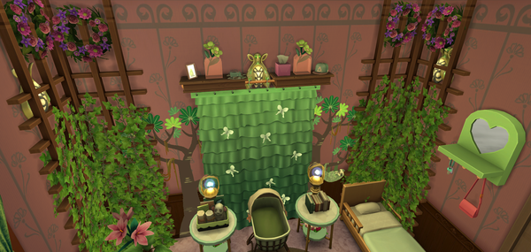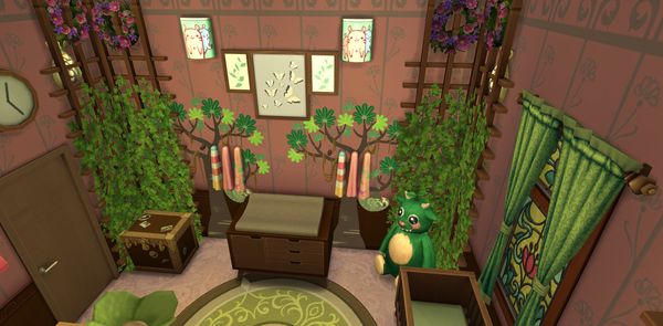 The nursery is lovely! 🙂The pink, green and brown colours are very nice and pretty wall pattern. The greenery in the room corners is a nice touch. The furnishing of the room and the warm wood texture of the furniture is lovely. The plushie is cute 🙂