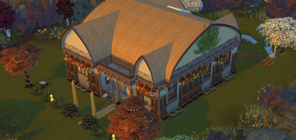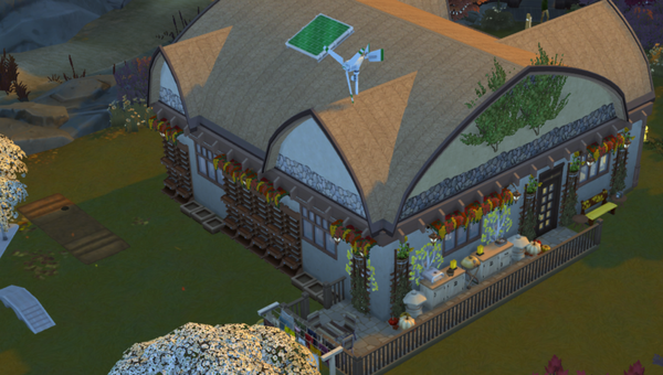 The exterior design of the home is very nice 🙂The glass roof front porch is great! It is a very nice place to enjoy restfully sitting there. The sparkling trees on the front corners are pretty. The side patio is a lovely place for sims to enjoy cooking and eating a meal from the chef’s oven or have some hot chocolate 🙂The plants on the walls are very nice.