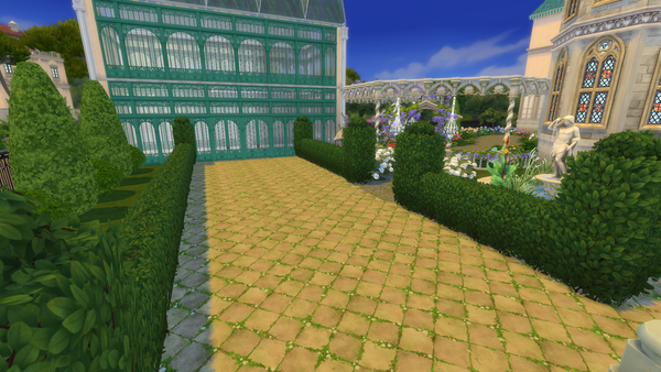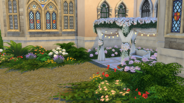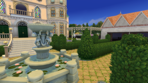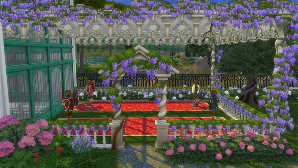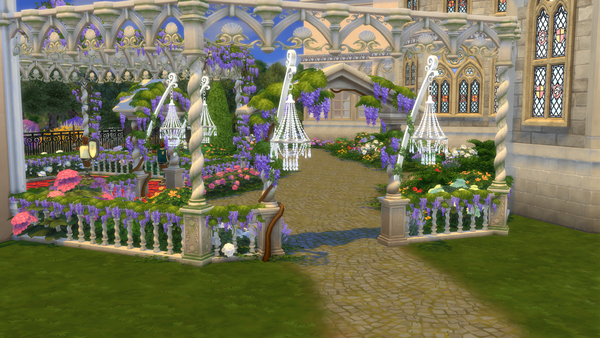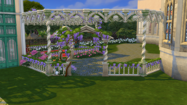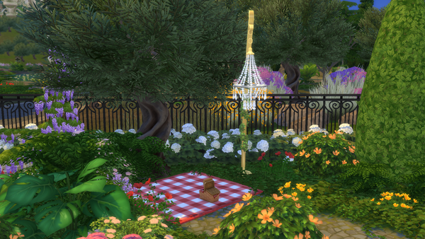 The outdoors areas are very lovely! 🙂The design of the sword training area is very great! The flowers are pretty along the edges of the pergola and very nice floral arch entry. The nook area with the hanging lamps is lovely. The sitting nook with the white curtained pergola is a special place to enjoy restfully sitting in a peaceful and pretty setting. The picnic blanket nook is lovely to enjoy a meal outdoors in the sunshine. The fountain in the courtyard is very nice. The flowers through the outdoors areas are beautiful ❤️