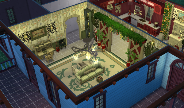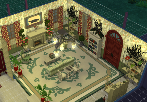 The living room is lovely! 🙂Very pretty furnishing and wall pattern. The green,red and white colours are very nice and lovely patterned flooring and curtains. Sims will enjoy reading, using the computer and playing chess there.