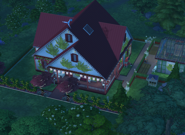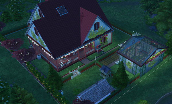 Side view with the greenhouse & animal enclosure. Used accent greenery and bug lights around the main house and garden greenhouse. At least they are not June Bugs.